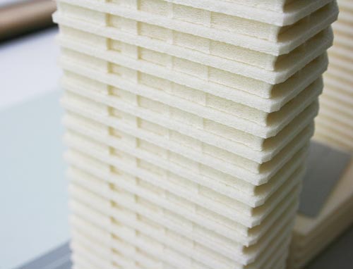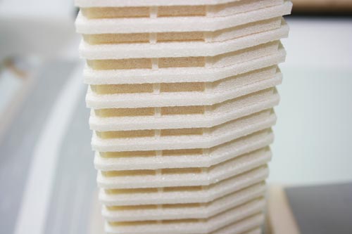 制作しているのは縮尺の小さい高層ビルで、3~5ミリにスライスした物をレーザーカッターで切り出したいます。ひたすらスタイロフォームでスタイロをスライスしていくのにはげんなりしてしまいました。ゆっくりしないと熱線は切れるし、遅いと進まないし気が散ると面がゆがむしで、結構集中しないとスライスだけでも大変です。今回は失敗が少なかったですが(50枚中2枚)ぐだぐだな日だとひどい事になります。